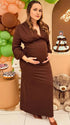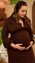 Chic-Brown Long Sleeve V-Neck Maternity Maxi Dress
