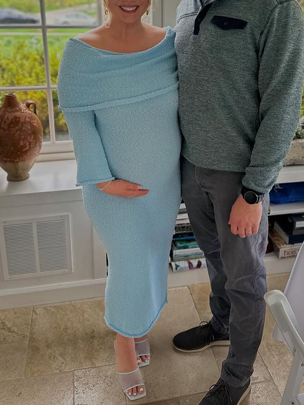 Chic- Knitting Off Shoulder Bodycon Sheer Flare Long Sleeve Maternity Maxi Dress