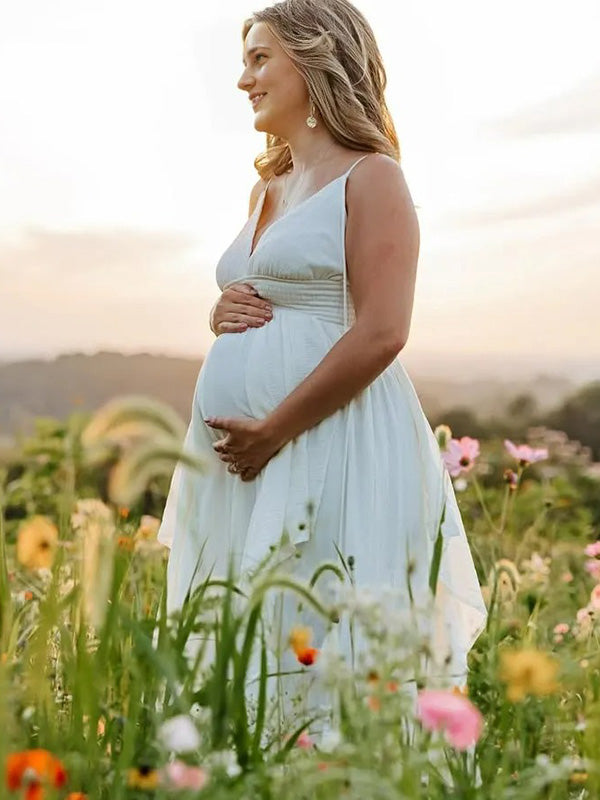 Celebrate your maternity journey in timeless elegance with this V-neck Backless Strapless Double-Layer Ruffled Maternity Maxi Dress— a stunning choice for maternity photoshoots, baby showers, gender reveal parties, weddings, and other unforgettable moments.