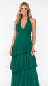 Features: Layered Tiered Skirt, Backless Halter Tie, Empire Waist, Full-Length Maxi